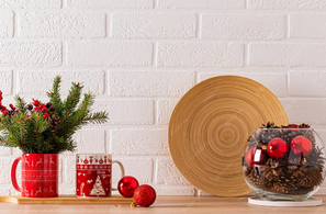 Use bandeja para agrupar e criar uma decoração com as bolas de Natal, pinhas e pequenos bonecos na sala ou na cozinha. Embrulhe algumas coisas vazias com papéis de presente e pronto, sua árvore de Natal está completa.